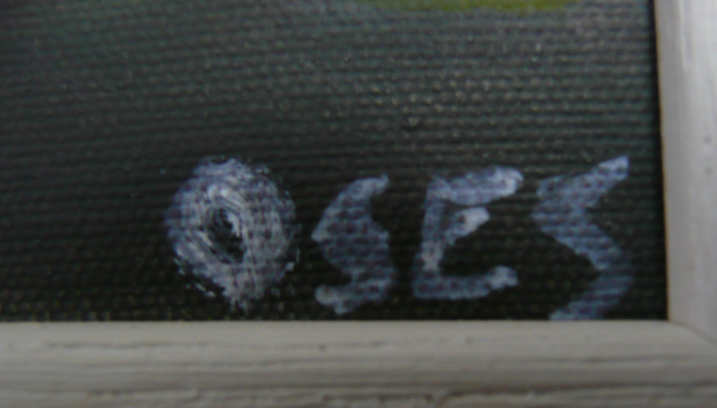 Firma de Maite Osés al inicio de su actividad pictórica. (Foto de Jesús Díaz). En su primer cuadro como pintora, "Paisaje con árbol y montañas", que consideramos más adelante, Maite utilizó la firma que vemos en la imagen superior, el primer apellido, OSES, representado con letras mayúsculas y de forma simple y directa, sin complejidades de trazo.
